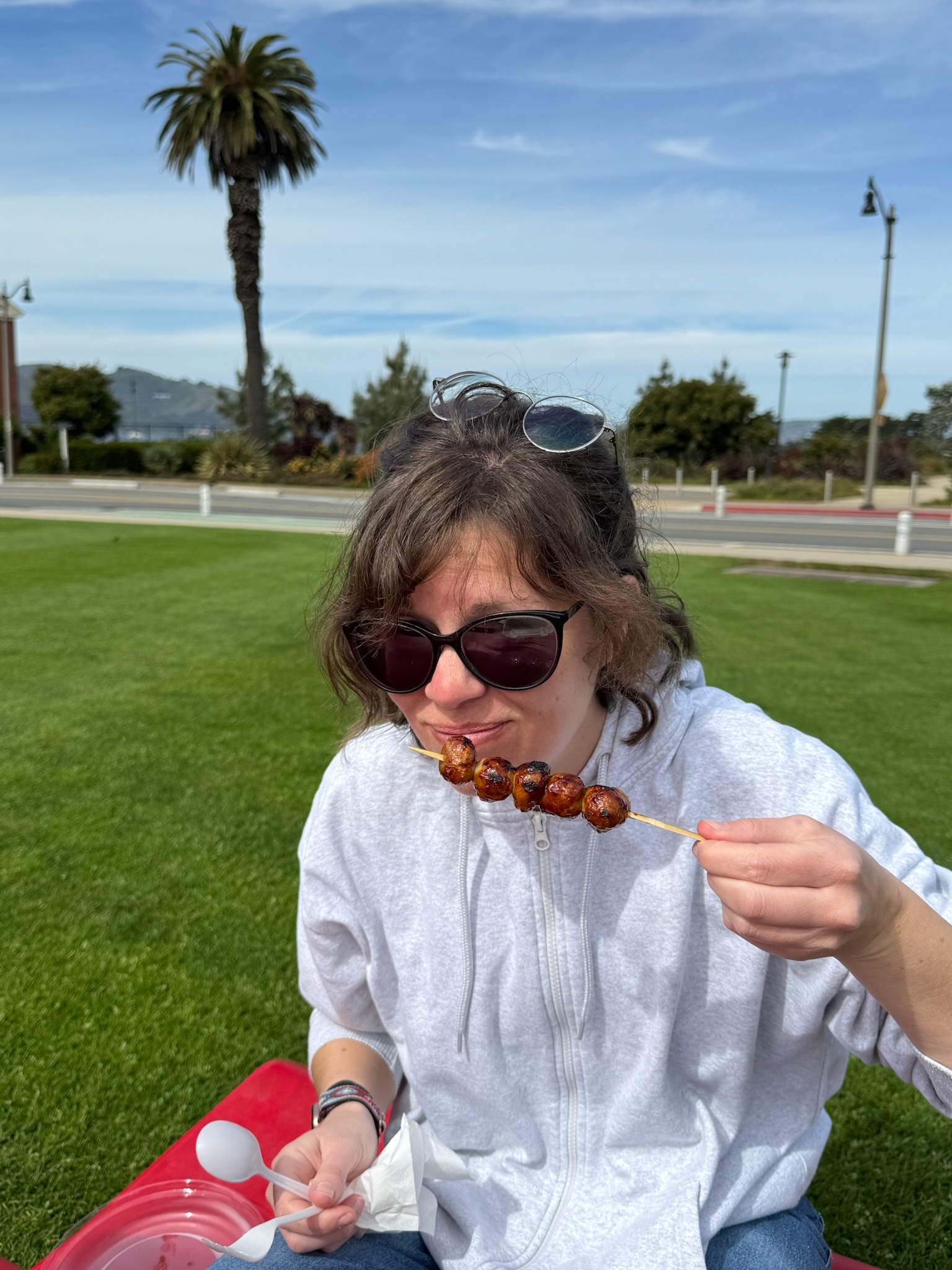 (J’ai la classe avec mes deux paires de lunettes) on mange au milieu des Quiscale Bronzés, étourneaux bavards, pigeons et autres goélands.