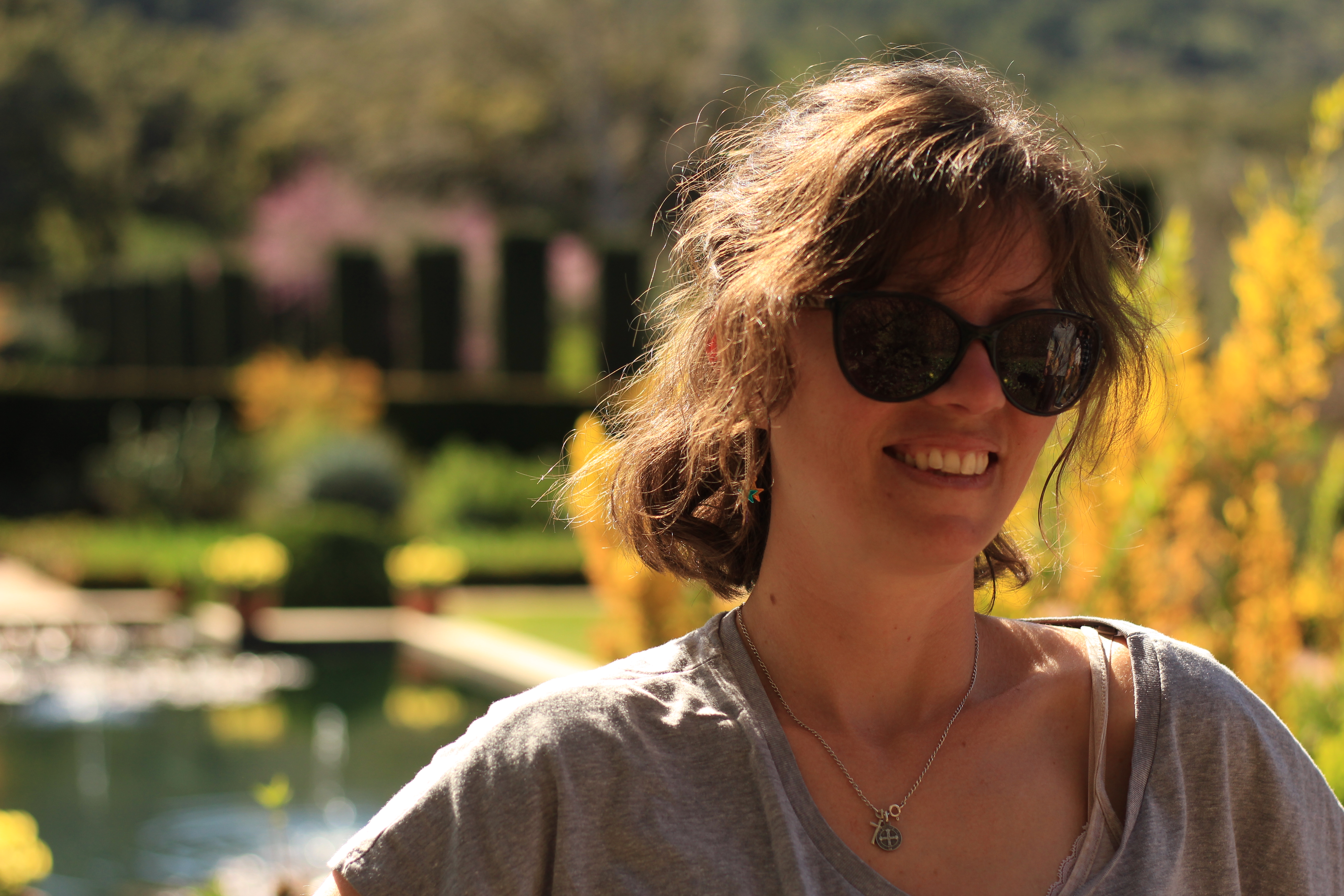 Ma tronche devant un plan d’eau et des acacias jaunes (à droite)